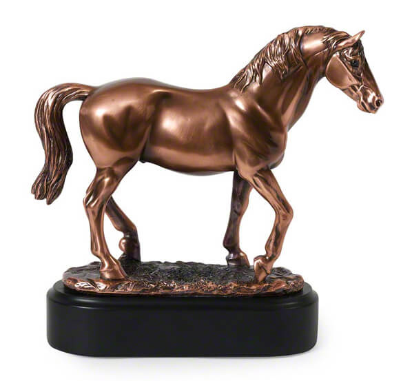 This beautifully sculpted keepsake horse urn, ‘Champion’, is electroplated in copper on a satin black plinth*.
